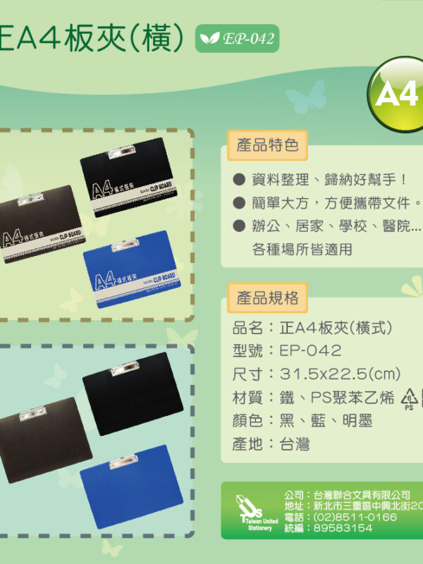 『台灣聯合』台灣聯合 正A4密集板板夾(橫) #EP-053