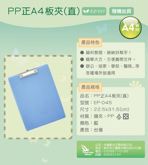 『台灣聯合』台灣聯合 PP正A4板夾(直)#EP-045