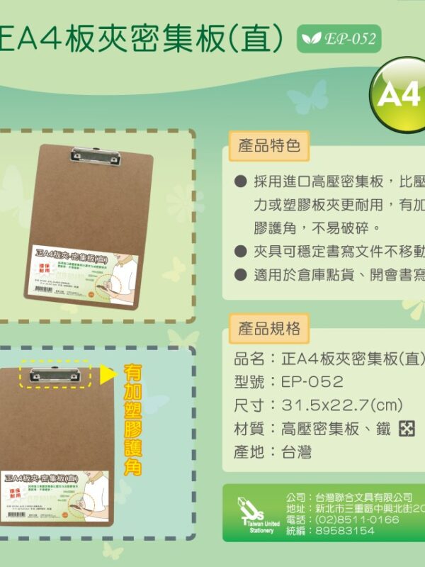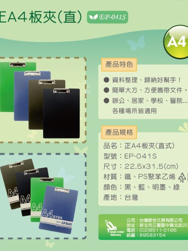 『台灣聯合』台灣聯合 正A4密集板板夾(直)#EP-052